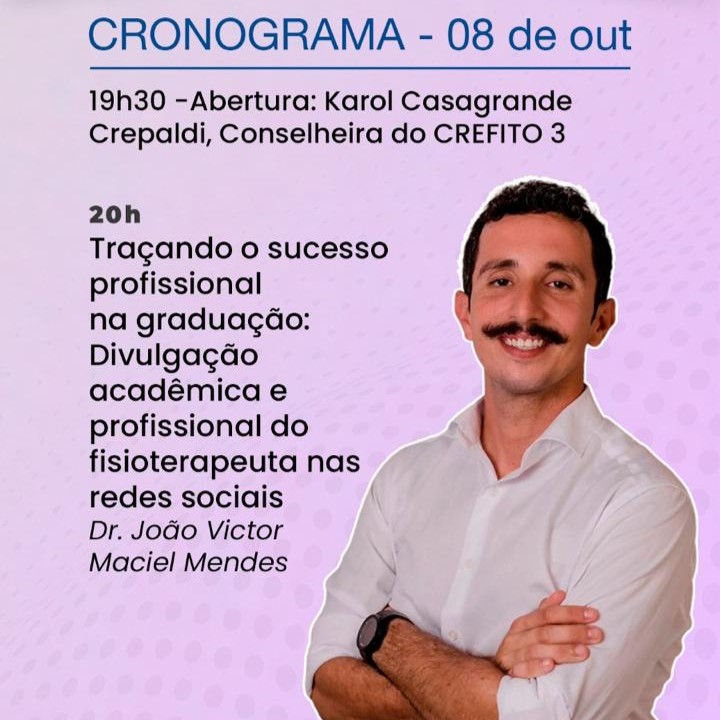 Às 19h30, a programação será aberta com a Dra Karol Casagrande Crepaldi, conselheira do Crefito 3. Em seguida, o fisioterapeuta Dr. João Victor Maciel Mendes ministrará a palestra “Traçando o sucesso profissional na graduação: divulgação acadêmica e profissional do fisioterapeuta nas redes sociais”.
