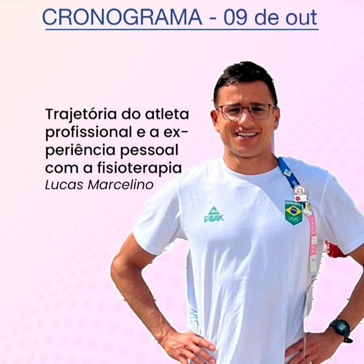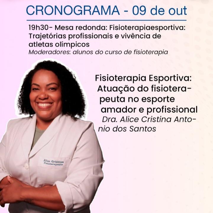 A partir das 19h30, os alunos do 10º termo conduzirão a Mesa Redonda Fisioterapia Esportiva: Trajetórias Profissionais e Vivência de Atletas Olímpicos”, com a participação da fisioterapeuta Dra. Alice Cristina Antônio dos Santos que vai falar sobre “Fisioterapia esportiva: atuação do fisioterapeuta no esporte amador e profissional”, e do atleta olímpico adamantinense Lucas Marcelino que falará sobre sua trajetória profissional e experiência pessoal com a fisioterapia.