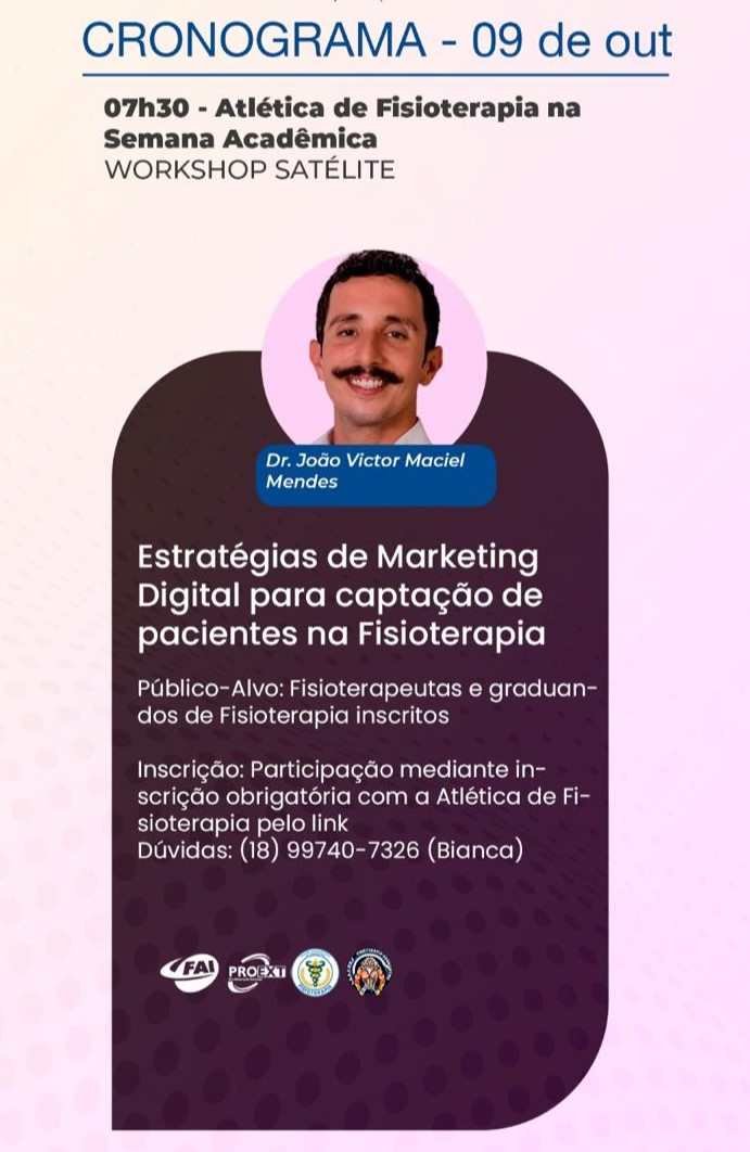 Já na quarta-feira, 9, a Atlética do curso promove o workshop satélite “Estratégias de marketing digital para captação de pacientes” desenvolvido pelo Dr. João Victor Maciel. Os interessados neste workshop devem se inscrever previamente. Mais informações pelo (18) 99740 7326.