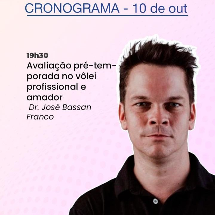 A programação se encerra com a palestra “Avaliação fisioterapêutica pré-temporada no vôlei profissional e amador”, com o fisioterapeuta Dr. José Bassan Franco, às 19h30.