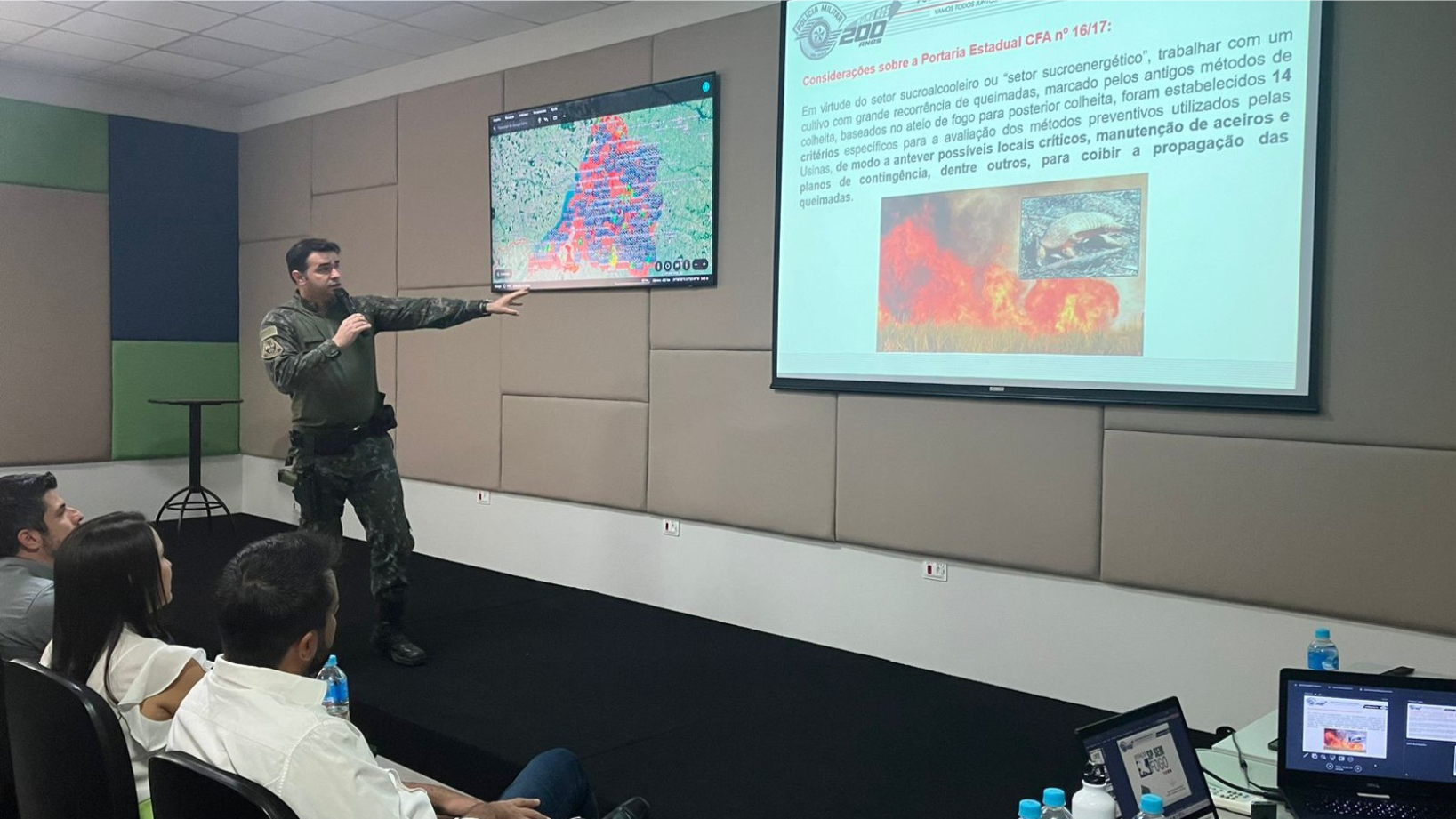 Durante o evento, a Polícia Ambiental apresentou uma importante ferramenta utilizada pela corporação que contribui no combate às queimadas, que é um sistema coordenadas geográficas com a possibilidade de acompanhamento e monitoramento mais precisos. Além disso, é possível verificar pontos com disponibilidade de água e diversas outras características, outros implementos mapeados que estão disponíveis por empresas e poder público para poder atuar.