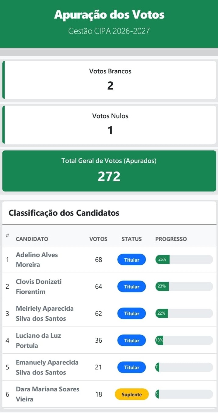 A Prefeitura de Adamantina concluiu nesta sexta-feira (13), às 17h, a eleição dos novos integrantes da Comissão Interna de Prevenção de Acidentes (CIPA), responsável por promover ações voltadas à saúde e à segurança dos servidores municipais.
