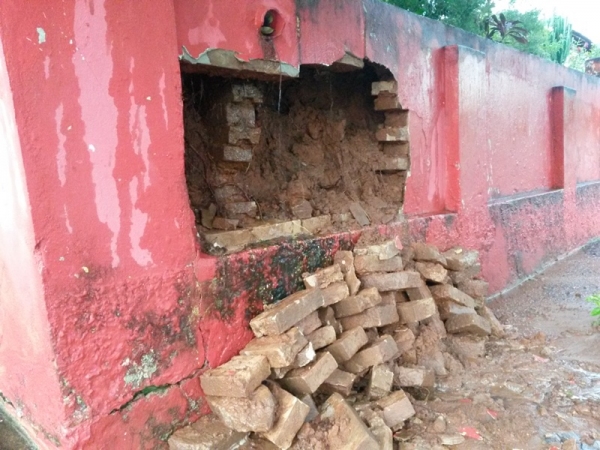 No cruzamento da rua Joaquim Nabuco com a Alameda dos Expedicionários, parte de um muro não resistiu ao acúmulo de água e cedeu.