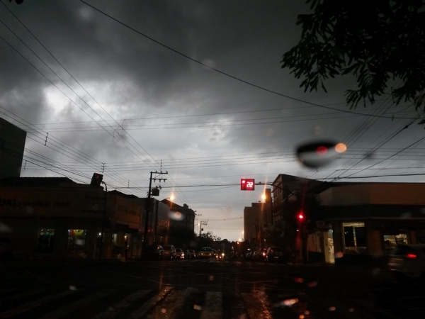 O tempo deixou o centro escuro e até a iluminação pública, que é acionada por sensores, acendeu automaticamente.