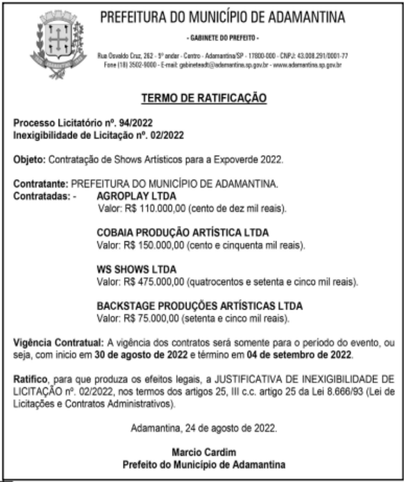 Quatro dos seis shows da ExpoVerde 2022, em contratações feitas pela Prefeitura de Adamantina, somam R$ 810 mil em recursos públicos. Os valores foram publicados nesta quinta-feira (24) no Jornal Diário do Oeste, em extratos do termo de ratificação da Processo Licitatório Nº 94/2022 – Inexigibilidade de Licitação Nº 02/2022.