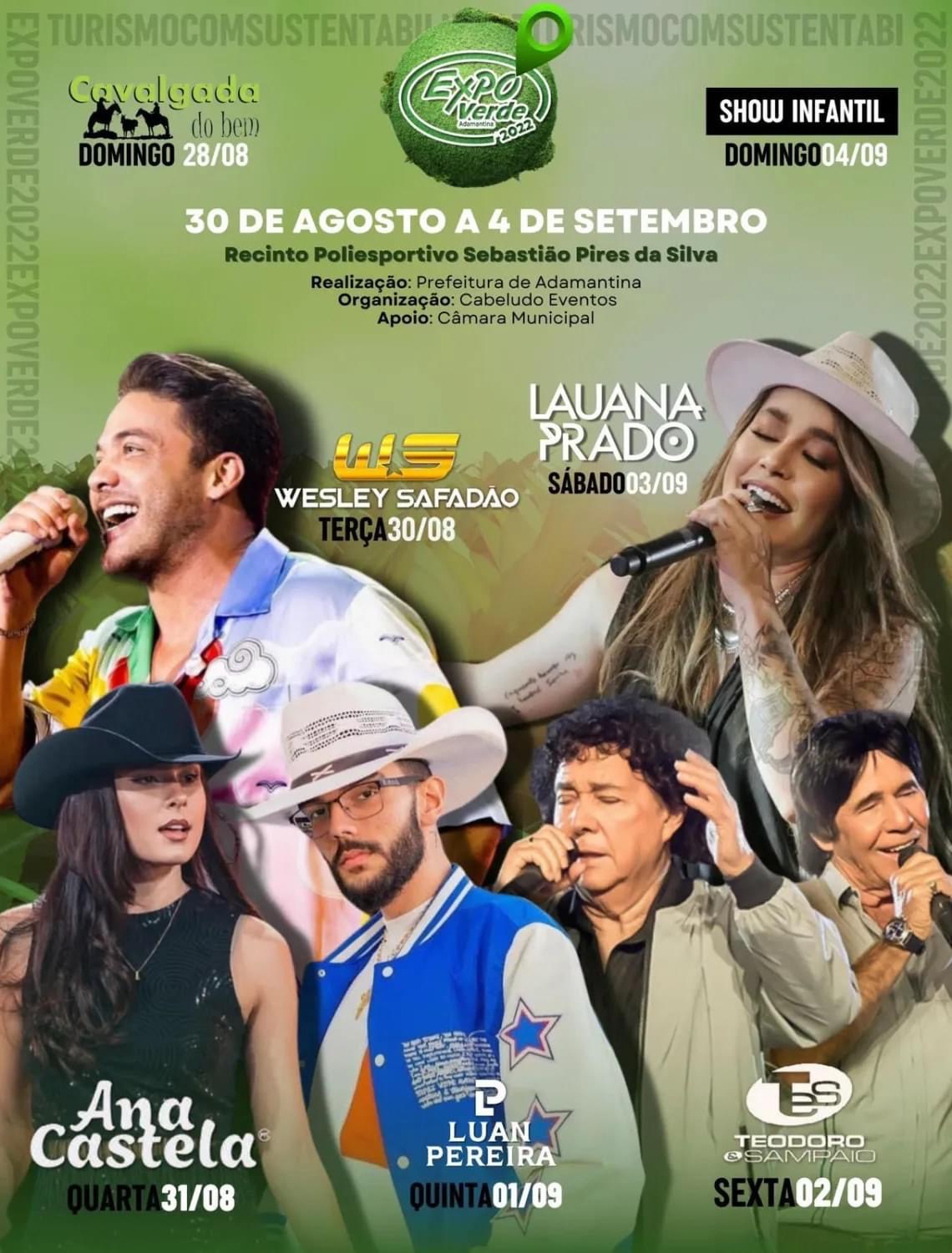 Além de Wesley Safadão que sobe ao palco na terça-feira (30), na quarta-feira (31), Ana Castela; na quinta-feira (1), Luan Pereira; na sexta-feira (2) Teodoro & Sampaio; no sábado (3), Lauana Prado e encerrando a festa, Dudinha e Mariana com a Galinha Pintadinha no domingo (4).