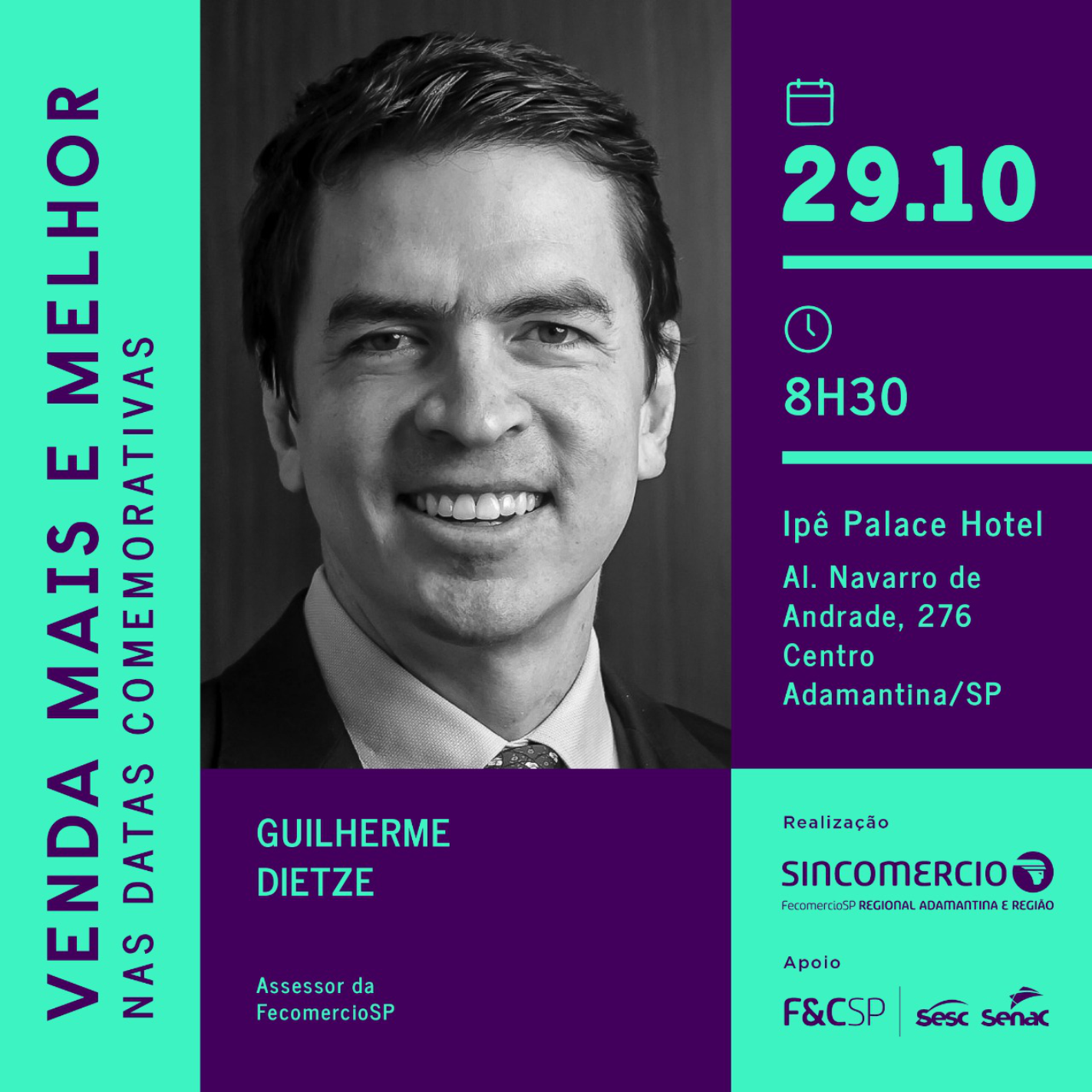 Com a proximidade da Black Friday e das vendas de Natal, o Sincomercio Adamantina realiza na próxima quarta-feira (29), às 8h30, no Ipê Palace Hotel, a palestra “Venda mais e melhor nas datas comemorativas”, ministrada por Guilherme Dietze, assessor da FecomercioSP.