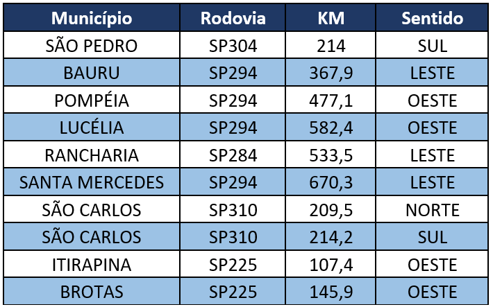 Conforme divulgou a Eixo SP, as obras terão início em Santa Mercedes, no quilômetro 670+300 da SP-294; e em Itirapina. Veja a localização das 11 novas PCE´s: