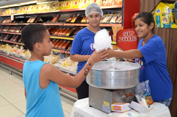 A equipe do Supermercado Godoy preparou uma deliciosa mesa com cachorro quente, pipoca, amendoim, salgados, doces, refrigerante, bolo, algodão-doce e sorvete de máquina, servidos durante toda a manhã.