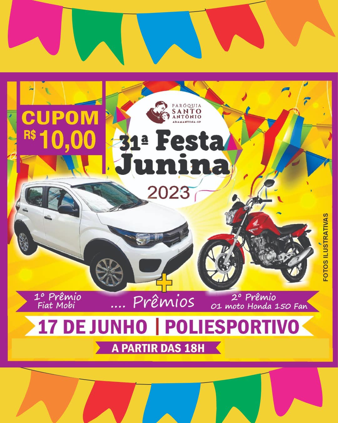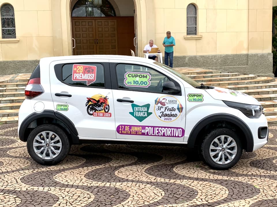 Depois de suspensa em 2020, 2021 e 2022 em razão da pandemia da Covid-19, a Paróquia Santo Antônio, de Adamantina, retoma neste ano sua tradicional Festa do Padroeiro, com o evento junino festivo no recinto poliesportivo e sorteio de prêmios, entre eles um automóvel Fiat Mobi e uma moto Honda 150 Fan.