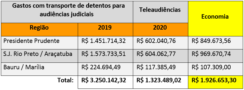 Dessa forma, seguem dados regionalizados da redução de custos após a substituição do trânsito de presos para audiências judiciais presenciais pela instalação e utilização de estações de teleaudiências dentro dos presídios, devido à pandemia do Coronavírus: