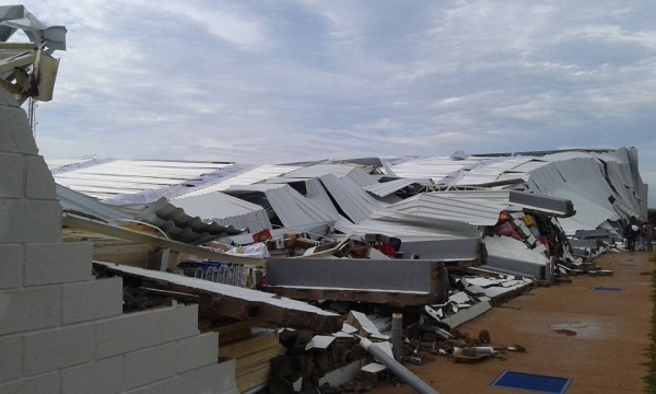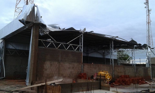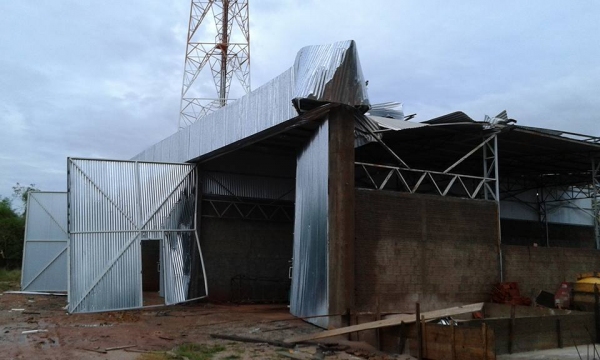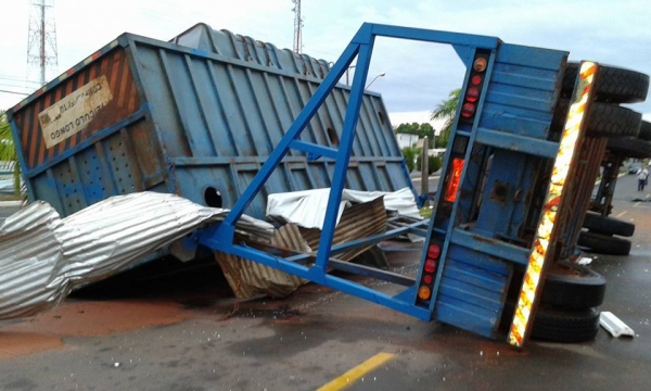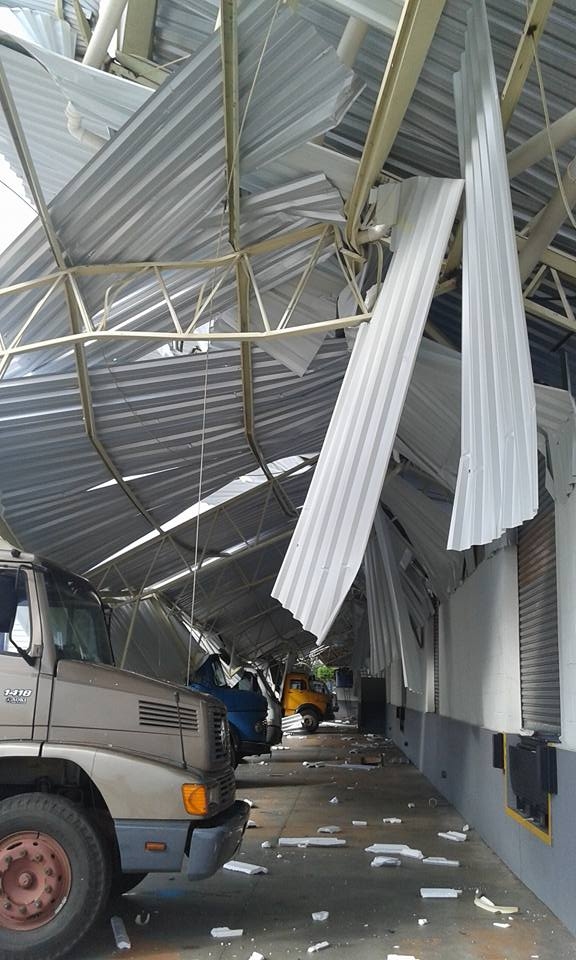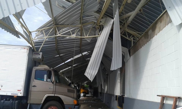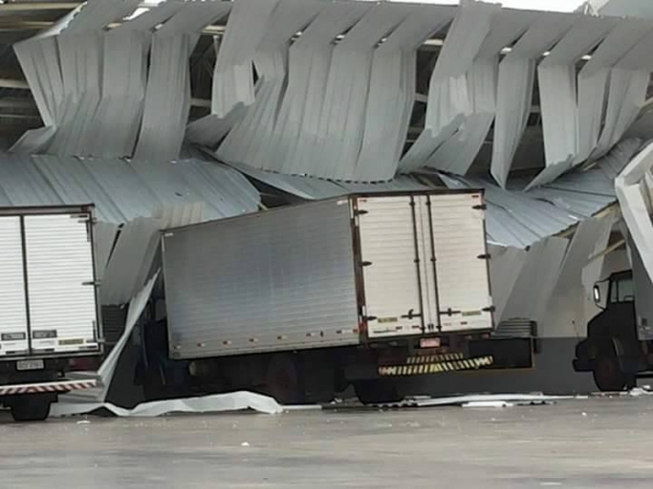 Ventos destruíram estrutura metálica de depósito e tombaram caminhão