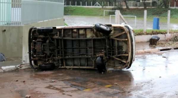 Uma Kombi acabou arrastada pela água, capotou e foi parar próximo a um bueiro, no Jardim Primavera, na região do prédio da merenda municipal.