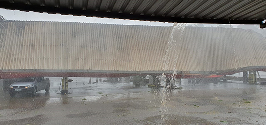 Um temporal com chuva e fortes ventos na tarde desta segunda-feira (14) destruiu parte da cobertura metálica do Auto Posto Trabuco, às margens da Rodovia Assis Chateaubriand, em Parapuã.