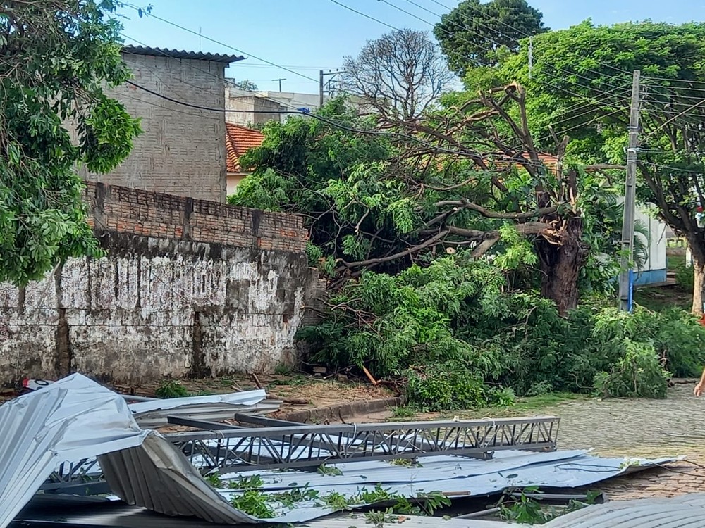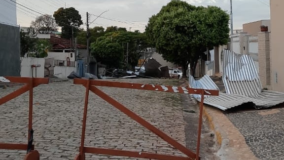 Uma empresa localizada nas proximidades do antigo Tiro de Guerra teve a cobertura metálica arrancada pela força dos ventos. A estrutura foi lançada na rua. Segundo a Defesa Civil municipal, cerca de 15 imóveis tiveram destelhamento, em diferentes proporções, sobretudo na região da Vila Caires. (Continua após a publicidade...)
