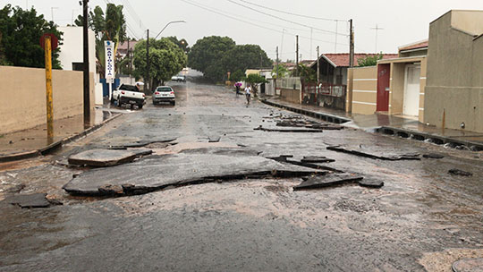Capas de asfalto foram deslocadas na esquina da Alameda dos Expedicionários com a Rua Euclides da Cunha, onde é frequente a ocorrência de alagamentos (Foto: Siga Mais).