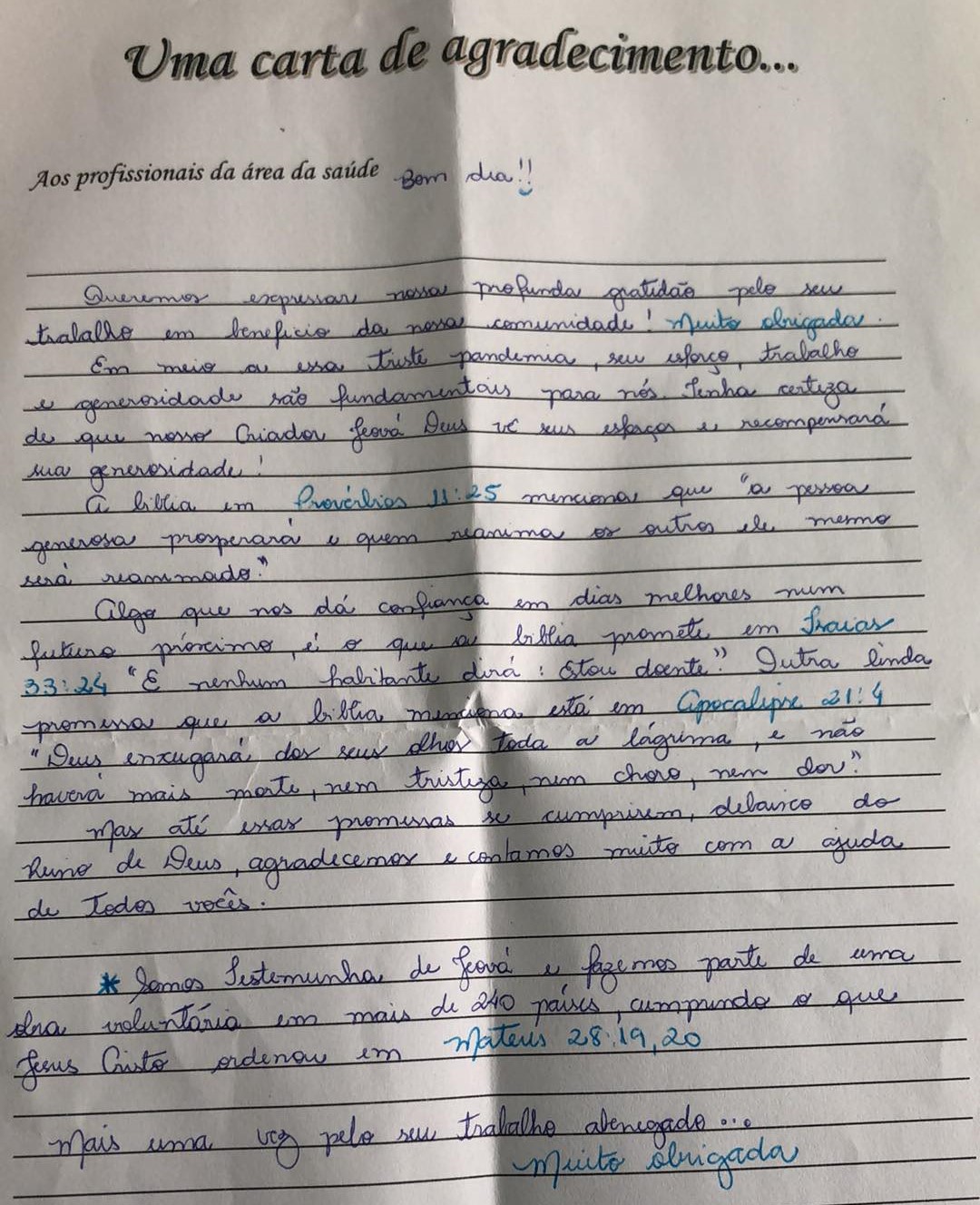 Carta de agradecimento, escrita de próprio punho pelas Testemunhas de Jeová (Reprodução).