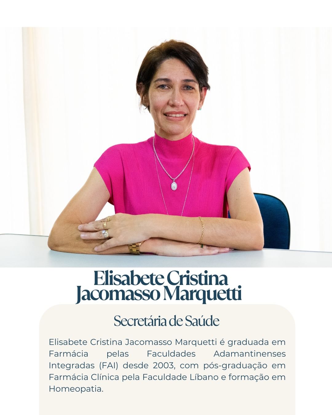 Como Secretária de Saúde de Adamantina, compromete-se a utilizar sua experiência para fortalecer a saúde pública local, buscando resultados positivos com foco no bem-estar e na qualidade de vida de toda a comunidade.