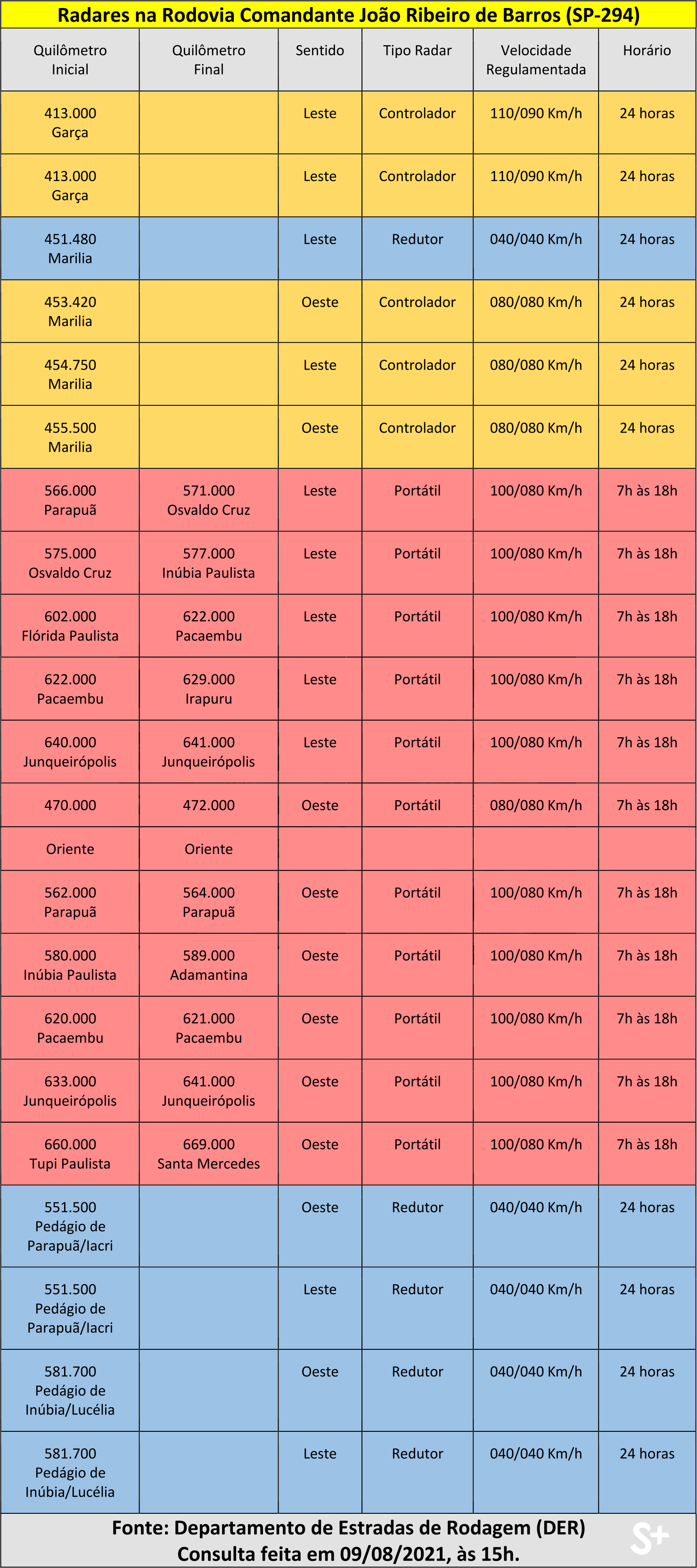 A Rodovia Comandante João Ribeiro de Barros (SP-294), no trecho entre Garça e Santa Mercedes, tem 21 pontos com fiscalização eletrônica de velocidade, por radares (veja quadro abaixo). As informações públicas sobre a localização dos dispositivos estão no site do Departamento de Estradas de Rodagem (DER), consultado nesta segunda-feira (9) pelo SIGA MAIS.