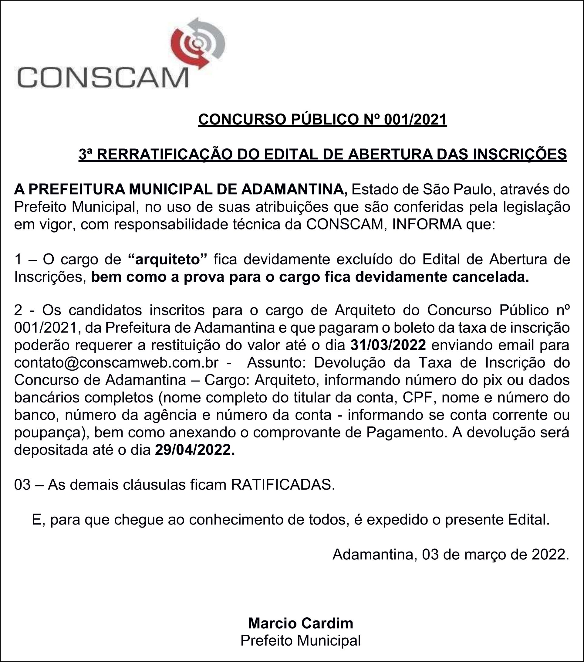 De acordo com a 3ª ratificação do edital publicada na última quinta-feira, os candidatos inscritos para o cargo de arquiteto que pagaram o boleto da taxa de inscrição poderão requerer a restituição do valor até o dia 31 de março, enviando e-mail para contato@conscamweb.com.br.