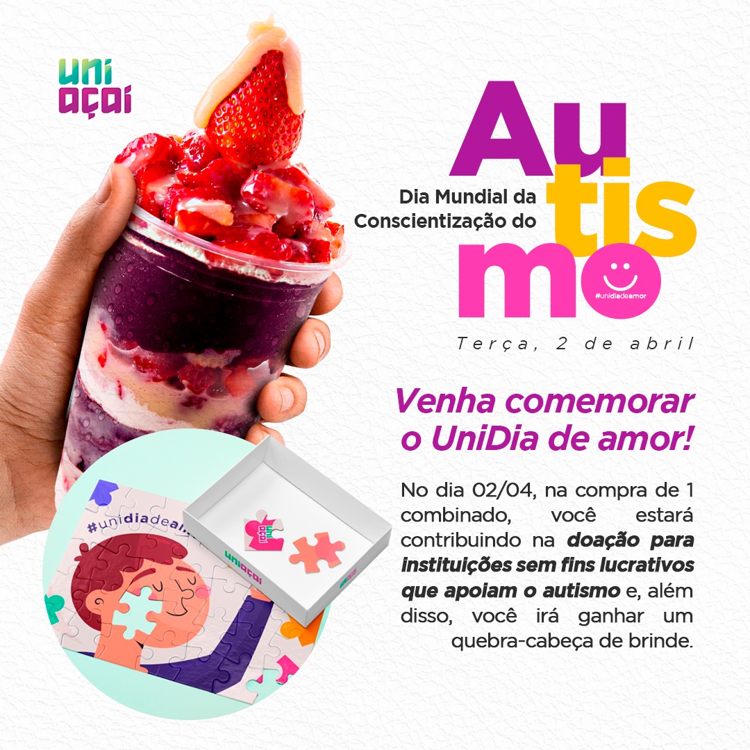A Uniaçaí Adamantina promove nesta terça-feira (2), Dia Mundial de Conscientização sobre o Autismo, uma ação especial para ampliar informações e conscientização sobre o tema. No dia de hoje, na compra do item da campanha – Copo Uniaçaí de 500ml ou 70 ml – o cliente ganha um quebra cabeça e parte da renda será revertido a instituições que atuam no cuidado à pessoa autista (assista).