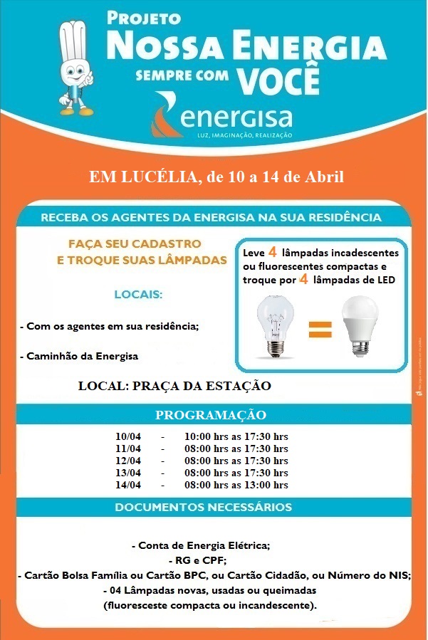 Famílias de Lucélia beneficiadas pelo programa Tarifa Social de Energia Elétrica (TSEE) podem aproveitar a oportunidade para trocar lâmpadas por meio do projeto Nossa Energia, da Energisa.