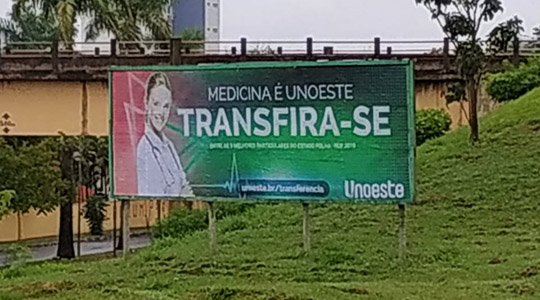 A instalação de um outdoor com uma peça publicitária da Universidade do Oeste Paulista (Unoeste) em Adamantina, para divulgar a possibilidade de transferência de alunos do curso de medicina à instituição, causou reação em setores da sociedade e nas redes sociais, nesta quinta-feira (27).