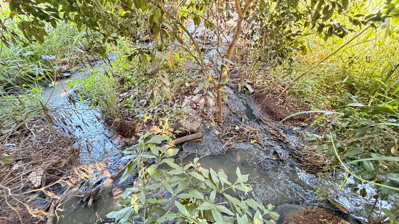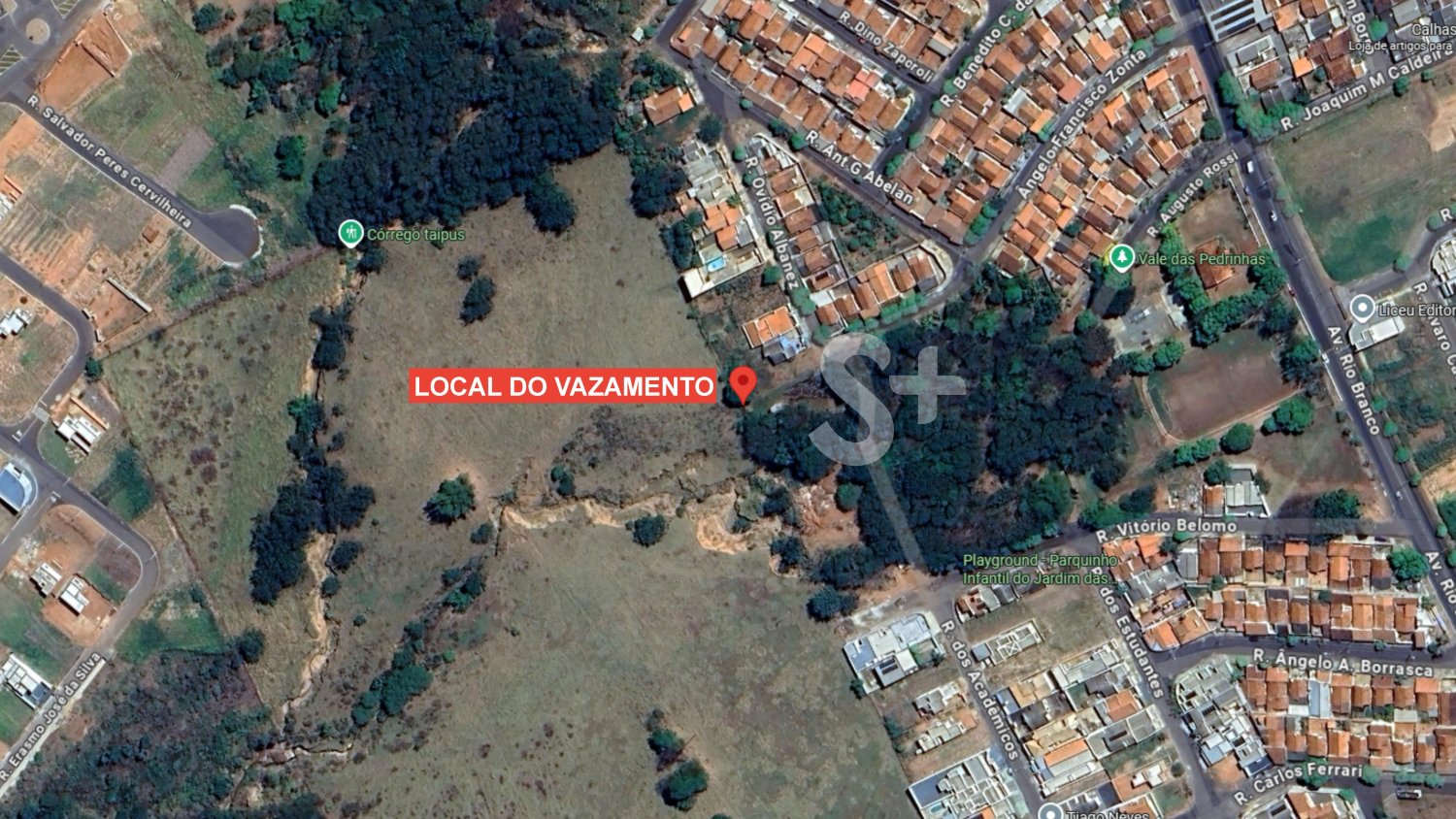 Com o transbordamento, o material escoa pela superfície e atinge diretamente uma área de vegetação. Conforme mapas oficiais do município, a região onde ocorre o vazamento de esgoto fica na bacia de nascentes do Córrego Taipus.