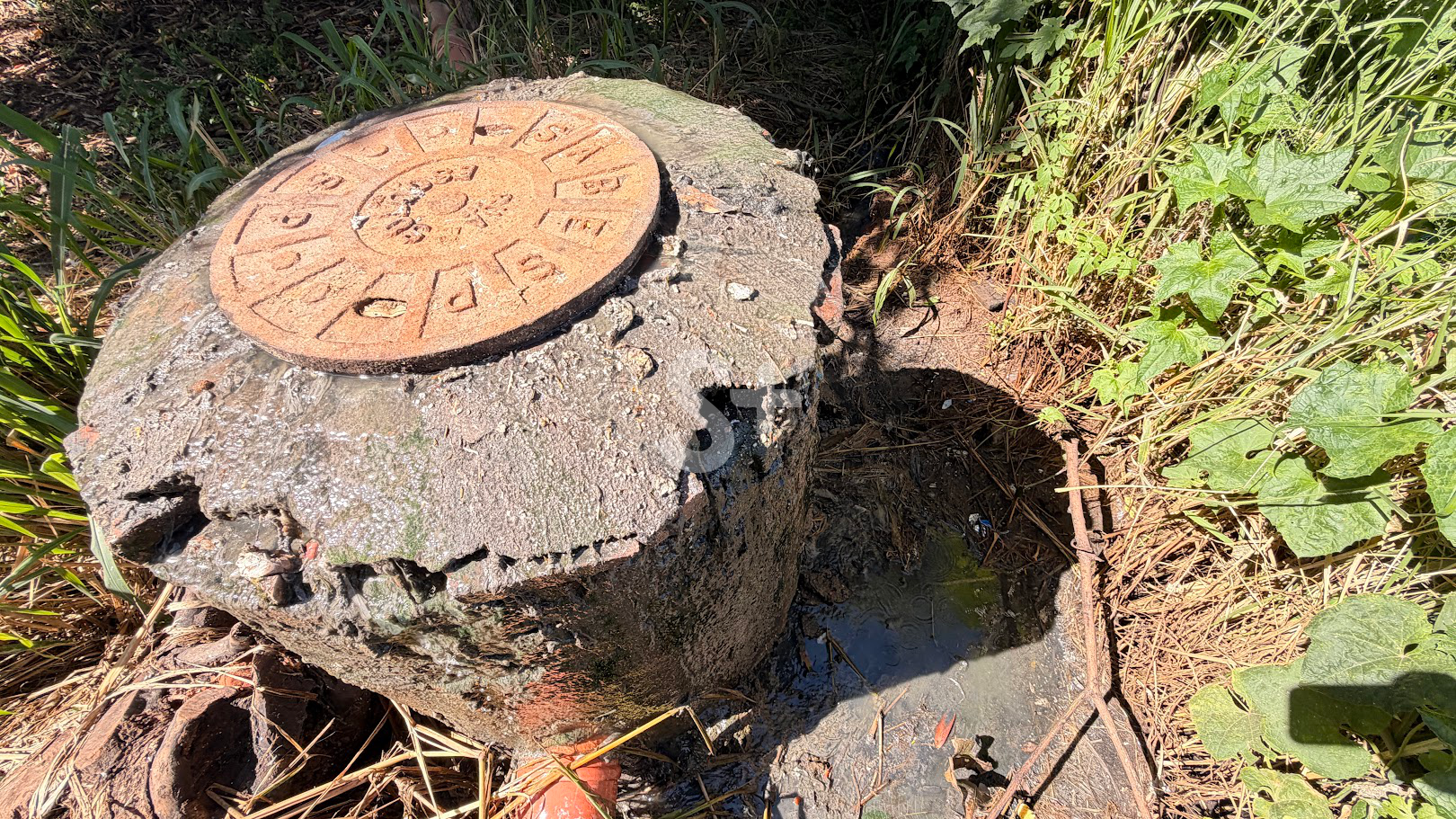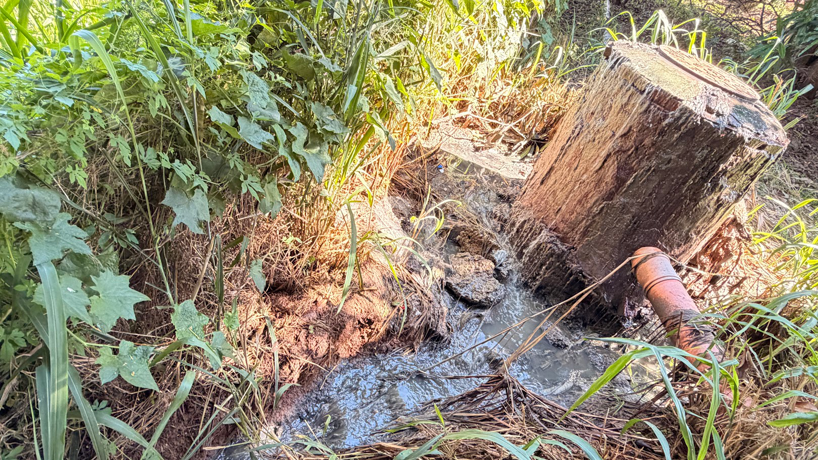 No local, em um aárea ao final do encontro da Rua João Vicente de Miranda com a Rua Ovídio Albanez, o esgoto transborda de um poço de vistoria (PV) em alvenaria, estrutura que integra o sistema coletor do bairro e direciona os resíduos a uma estação elevatória situada a poucos metros dali, já na área do Parque Universitário.
