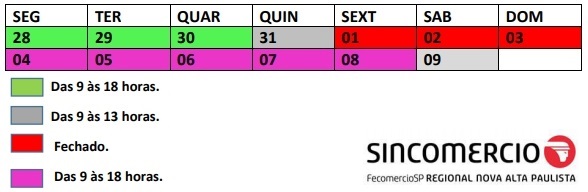 Já na próxima semana, de segunda-feira (4) a sexta-feira (8), o comércio vai funcionar das 9h às 18h. No sábado (9), das 9h às 13h.