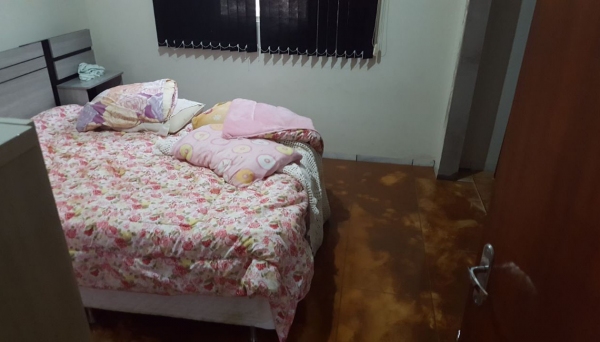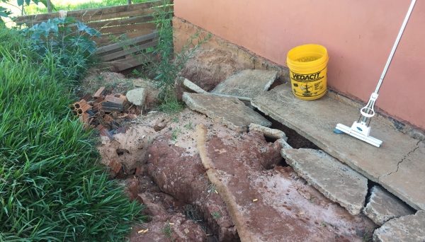 Em um dos imóveis a área externa de terra é alvo da força das águas, que passa pelo entorno do imóvel e atravessa o quintal em direção aos fundos, arrastando terra e colocando em risco a estrutura da edificação.
