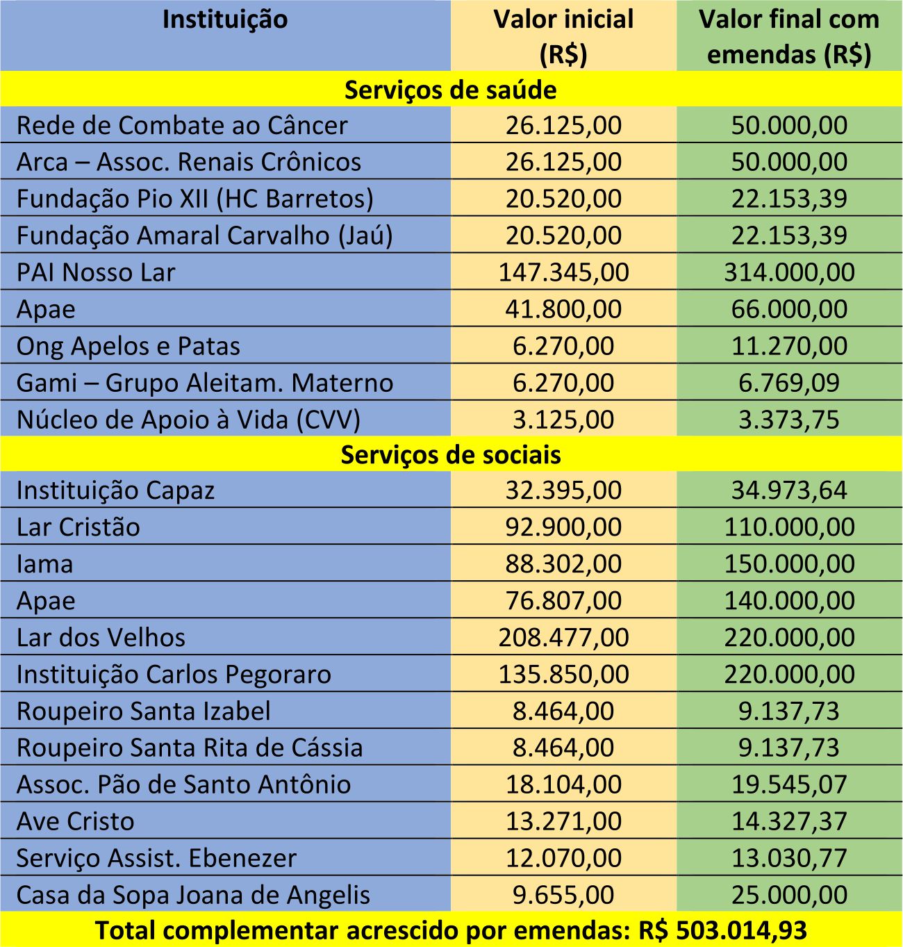 As entidades que atuam nas áreas de assistência social, saúde, educação, entre outras áreas, em Adamantina, terão recursos extras de R$ 503.014,93, oriundos dos cofres públicos municipais, para a manutenção e custeio de suas atividades, no ano que vem (veja detalhamento abaixo). Esses recursos foram originados de emendas ao orçamento municipal e à lei de subvenções, votadas na noite desta quarta-feira (9). O texto original, enviado pela Prefeitura, sofreu alterações que permitiram os valores adicionais.