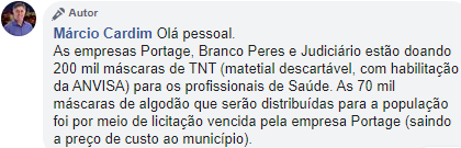 Segundo informou o jornal Diário do Oeste nesta quinta-feira (30), as máscaras custaram R$ 154 mil aos cofres públicos, e foram adquiridas pela Prefeitura de Adamantina junto à indústria de confecções Portage, em caráter emergencial. Em publicação em sua rede social, o prefeito afirma que as máscaras foram adquiridas a preço de custo.