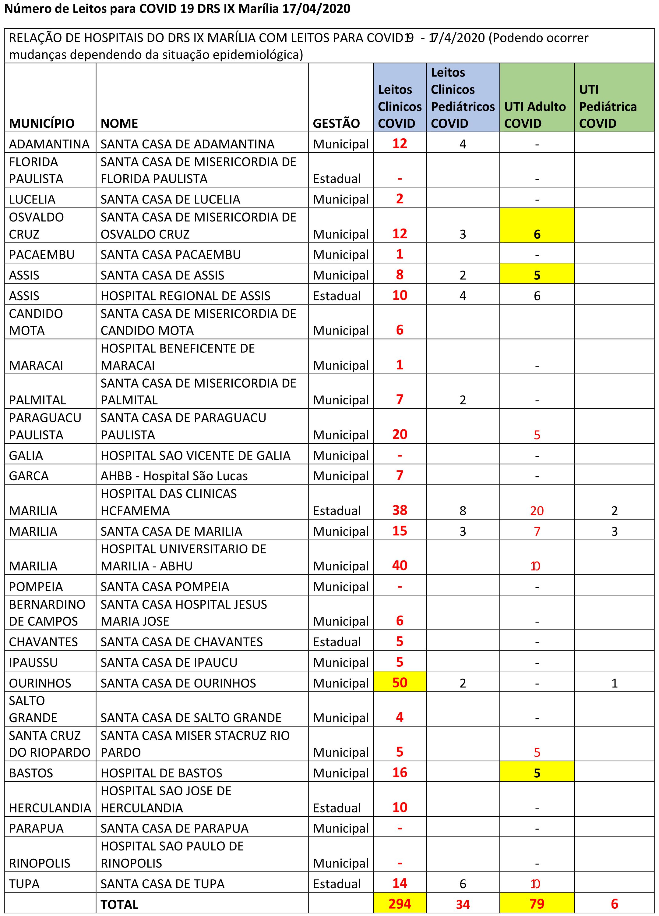 Segundo dados da DRS de Marília, para o atendimento de pacientes com Covid-19 das regiões de saúde de Adamantina, Assis, Marília, Ourinhos e Tupã foram disponibilizados 79 leitos de UTI adultos e 6 pediátricos. Em relação a leitos clínicos para pacientes Covid-19, são 299 vagas para pacientes adultos e 34 para pacientes pediátricos. Na região coberta pela DRS de Marília são cerca de 1,1 milhão de habitantes.