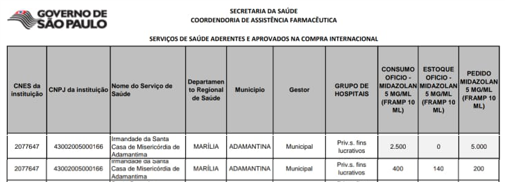Adamantina é uma das cidades do Estado que irá receber o material de sedação. O município foi incluído na compra emergencial internacional dos chamados kits intubação, para pacientes que estão internados com covid-19.