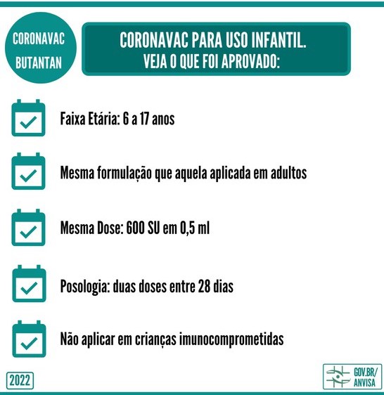 Em reunião realizada nesta quinta-feira (20), a Diretoria Colegiada da Anvisa (Agência Nacional de Vigilância Sanitária) aprovou, por unanimidade, o uso pediátrico da Coronavac. A autorização de uso emergencial para a inclusão de nova faixa etária em bula foi concedida especificamente para o público compreendido entre 6 e 17 anos, crianças e adolescentes não imunocomprometidos, baseada em estudos realizados em diversos países, como China e Chile, e apresentados pelo Instituto Butantã no processo.