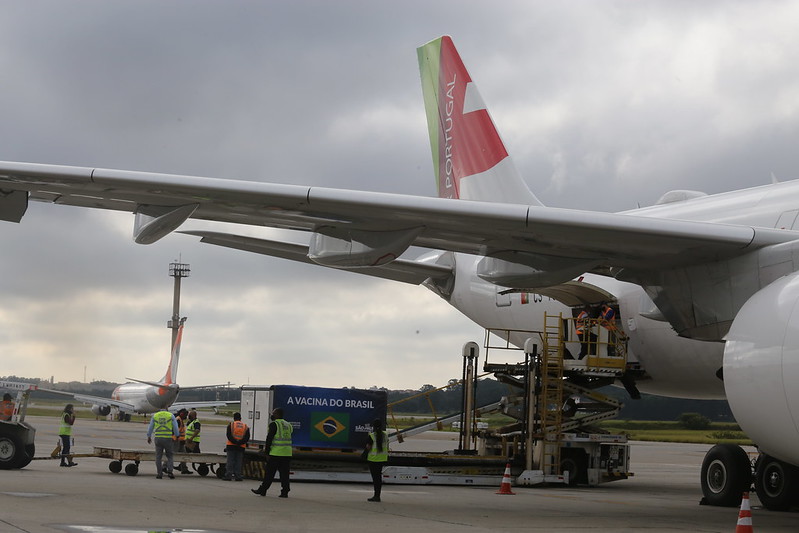 A carga chegou ao Aeroporto Internacional de Guarulhos às 7h20, trazendo 5,6 mil litros de IFA (Insumo Farmacêutico Ativo) que permite a produção de 8,7 milhões de doses na fábrica do Butantan. A carga foi transportada pela empresa aérea TAP e saiu da China na terça (9), com escalas na Finlândia e Portugal.