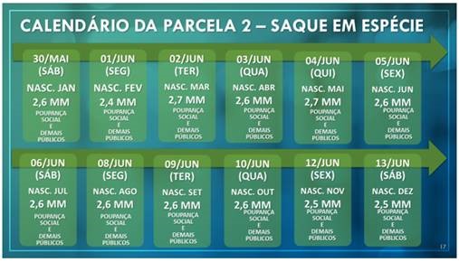 Ainda de acordo com a Caixa, continua à disposição do beneficiário a possibilidade de movimentação do recurso pela Poupança Social Digital. Desde o dia 20 de maio, já foram creditadas 31 milhões de contas para pagamento da segunda parcela, totalizando R$ 20,3 bilhões.