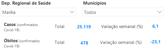 Em relação ao número de casos notificados, as cidades ligadas ao DRS de Marília somam 25.119 registros desde o início da pandemia, com variação semanal de 6,1%, e 478 óbitos confirmados atribuídos à doença, com variação semanal de -23,1%