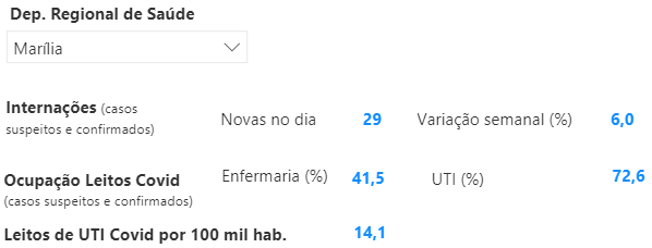 Segundo dados completos divulgados pelo Governo de SP, tabulados pelo Seade, as cidades que integram o Departamento Regional de Saúde (DRS) de Marília mostram 29 novos casos de internação (entre suspeitos e confirmados para Covid-19), no dia, com uma variação semanal de 6%. Os números foram atualizados ontem, às 16h.