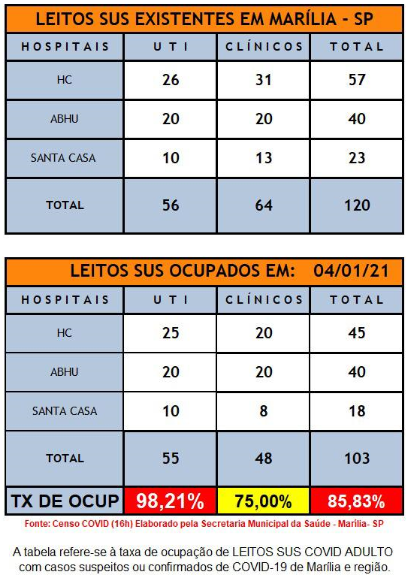 De acordo com a pela Secretaria Municipal de Saúde de Marília, os três hospitais de referência da cidade disponibilizam 56 leitos de UTI, dos quais 55 estão ocupados (98,21%), restando, até ontem, apenas uma vaga. São ofertados ainda 64 leitos de enfermaria, dos quais 48 estão ocupados (75%).