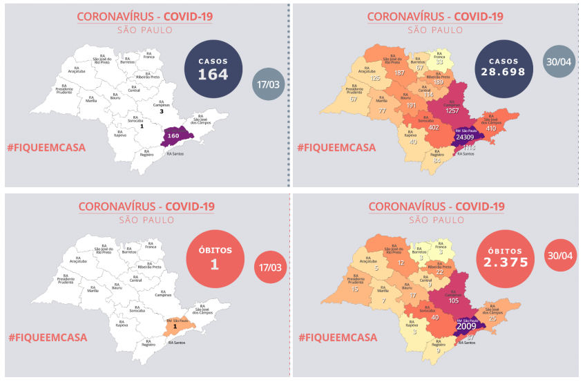 Apesar de o número absoluto de infectados se concentrar na Região Metropolitana de São Paulo (RMSP), que engloba a capital paulista e cidades do entorno, o contágio cresce proporcionalmente a um ritmo quatro vezes mais rápido no interior e no litoral de São Paulo. Na RMSP, o crescimento nesse mesmo período foi de 770%, passando de 2.793 para 24.309 casos.