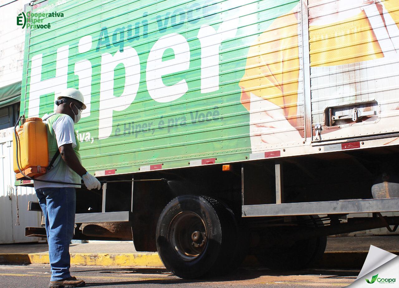A nova prática introduzida nas rotinas internas da loja Cocipa Hiper passa a higienizar os veículos da própria frota e de fornecedores que acessam as áreas de carga e descarga, ambientes do estoque e pallets usados na movimentação de mercadorias.