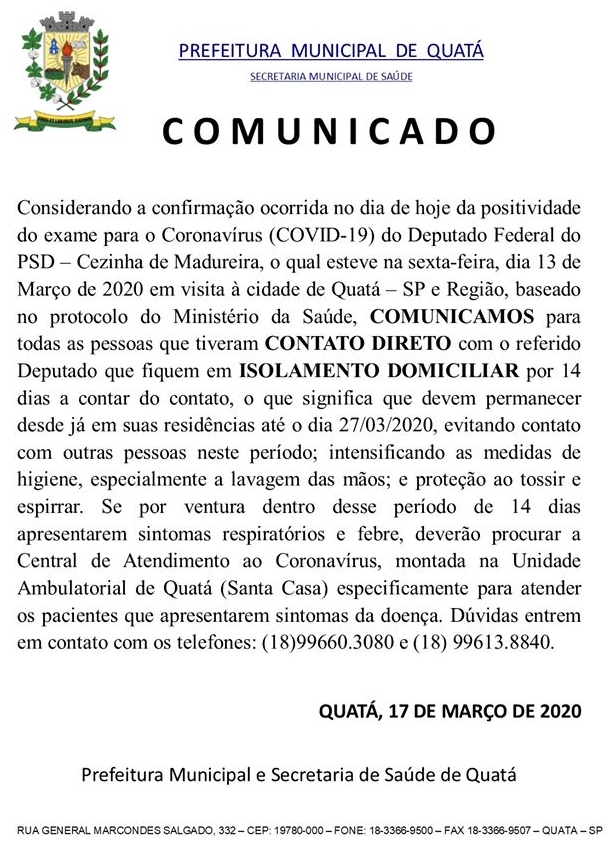 Quatá (a 43 km de Tupã) foi a primeira a emitir um comunicado oficial de alerta. É que ele esteve na cidade na última sexta-feira e agora todas as pessoas que tiveram contato com o parlamentar devem ficar em isolamento. A informação foi divulgada pela Prefeitura, em nova divulgada nas redes sociais: