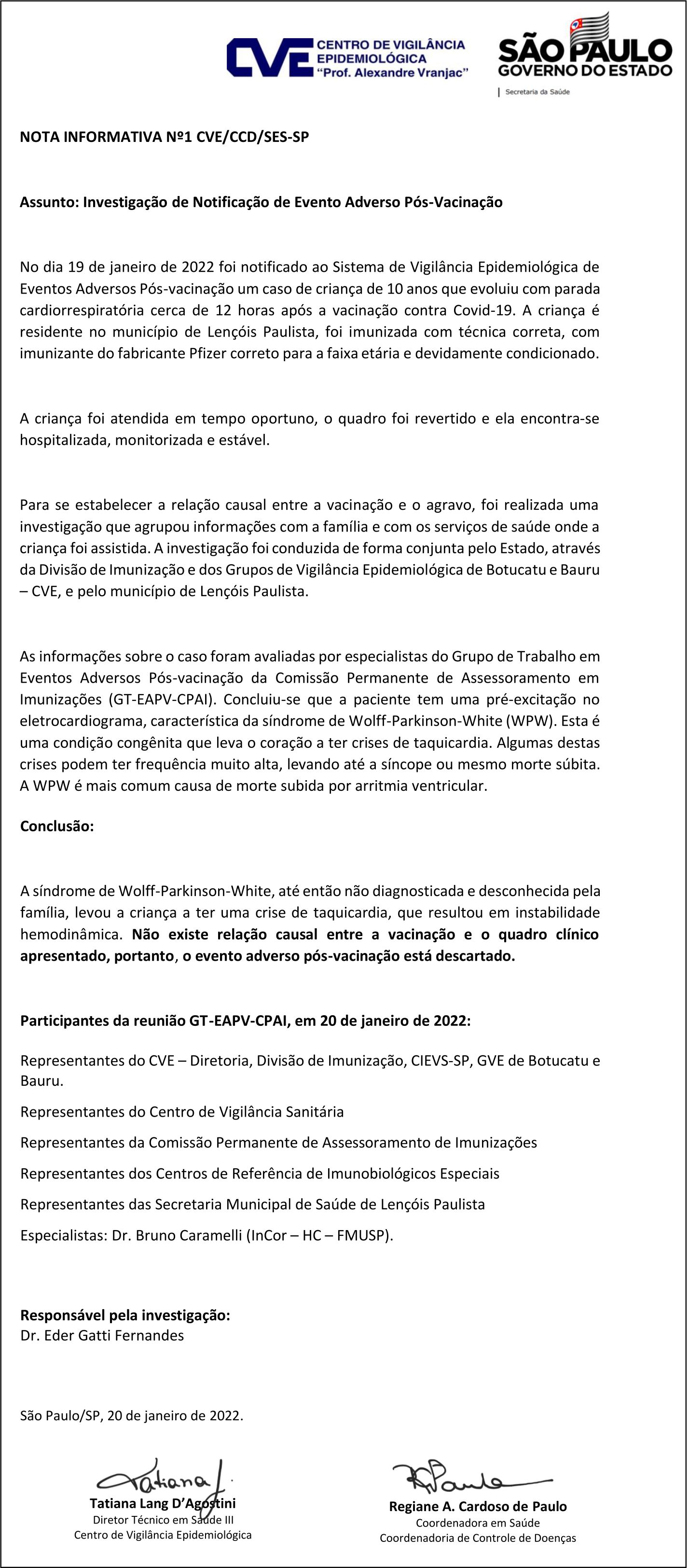 “O Centro de Vigilância Epidemiológica da Secretaria de Estado da Saúde informa que concluiu nesta quinta-feira (20) a investigação que descartou o evento adverso pós-vacinação na criança de dez anos do município de Lençóis Paulista. Não existe relação causal entre a vacinação e quadro clínico apresentado”, diz a nota do governo.