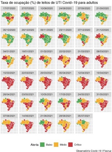 Seis capitais estão com taxas de ocupação de leitos de UTI Covid-19 iguais ou superiores a 80%: Boa Vista (97%), São Luís (83%), Rio de Janeiro (83%), Curitiba (85%) Goiânia (85%) e Brasília (82%). Onze capitais estão na zona de alerta intermediário, com taxas iguais ou superiores a 60% e inferiores a 80%: Porto Velho (69%), Manaus (62%), Tocantins (71%), Teresina (sem informação direta; número estimado em torno de 66%), Fortaleza (74%), Salvador (62%), Belo Horizonte (63%), Vitória (64%), São Paulo (66%), Porto Alegre (69%) e Campo Grande (78%). Dez capitais estão fora da zona de alerta: Rio Branco (28%), Belém (51%), Macapá (56%), Natal (53%), João Pessoa (48%), Recife (56%), Maceió (57%), Aracaju (58%), Florianópolis (52%) e Cuiabá (61%).