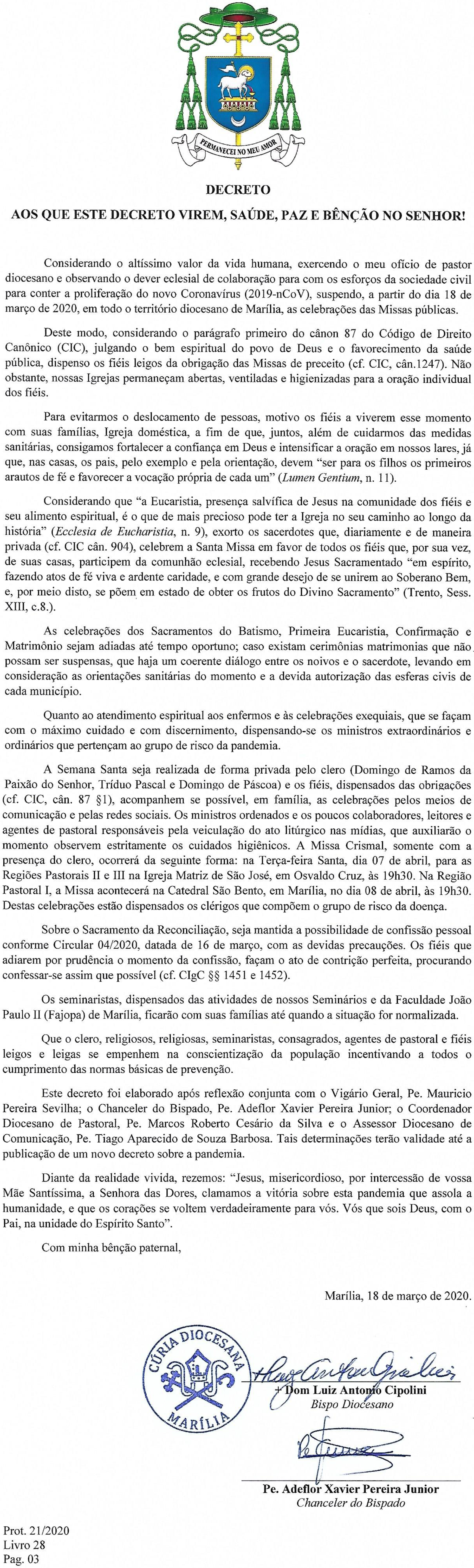 Dois dias depois de editar a Circular nº 04/2020, com restrições às atividades religiosas nas igrejas católicas da Diocese de Marília (reveja), o bispo diocesano Dom Luiz Antonio Cipolini editou e fez divulgar nesta quarta-feira (18) um Decreto onde tornam ainda mais restritivas as medidas adotadas no sentido de ampliar os esforços para tentar evitar o contágio pelo vírus coronavírus (Covid-19). Em Adamantina, as novas medidas atingem as três paróquias e suas atividades.