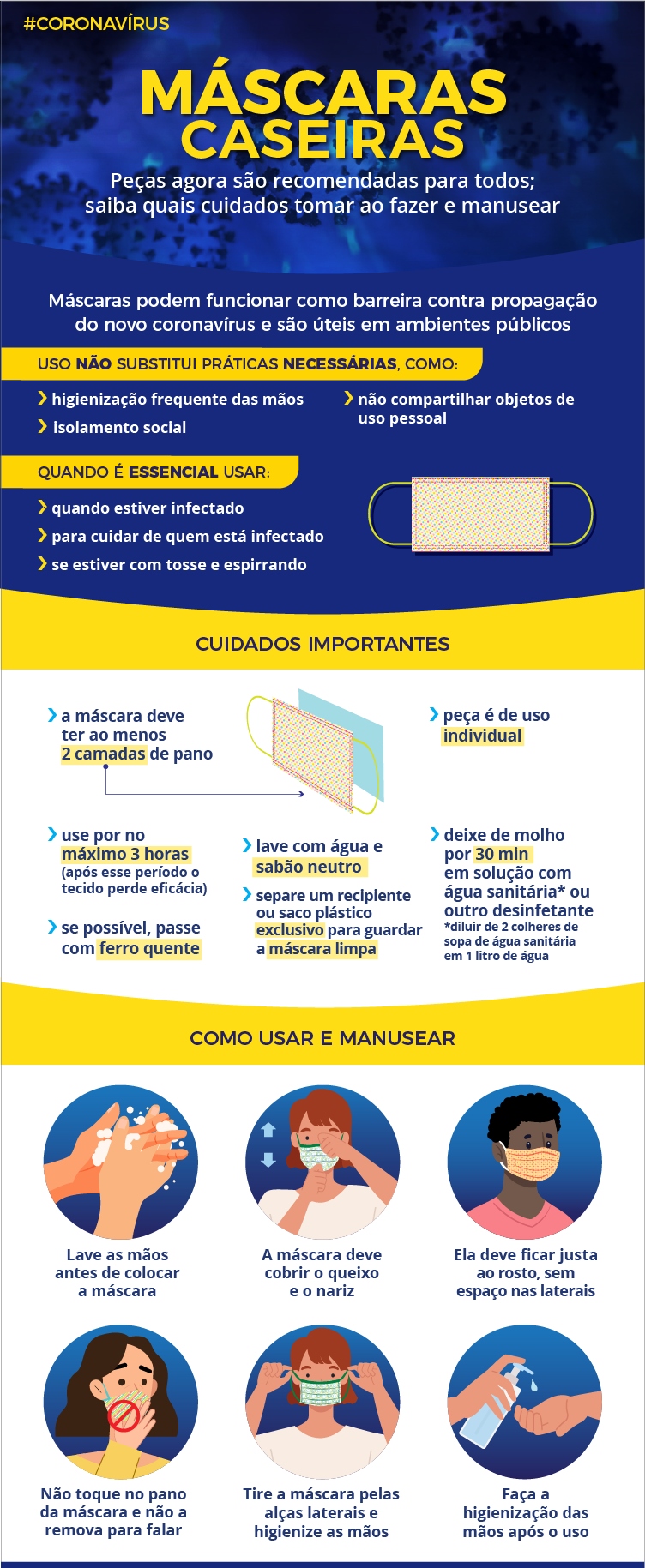 No material há informações sobre que tipo de tecido pode ser usado, quais são os procedimentos de produção, os cuidados e a forma adequada de uso de máscara caseira ou artesanal. Além disso, há advertências sobre a manejo e dicas de limpeza e descarte, bem como outras medidas preventivas contra o novo coronavírus. Acesse aqui.