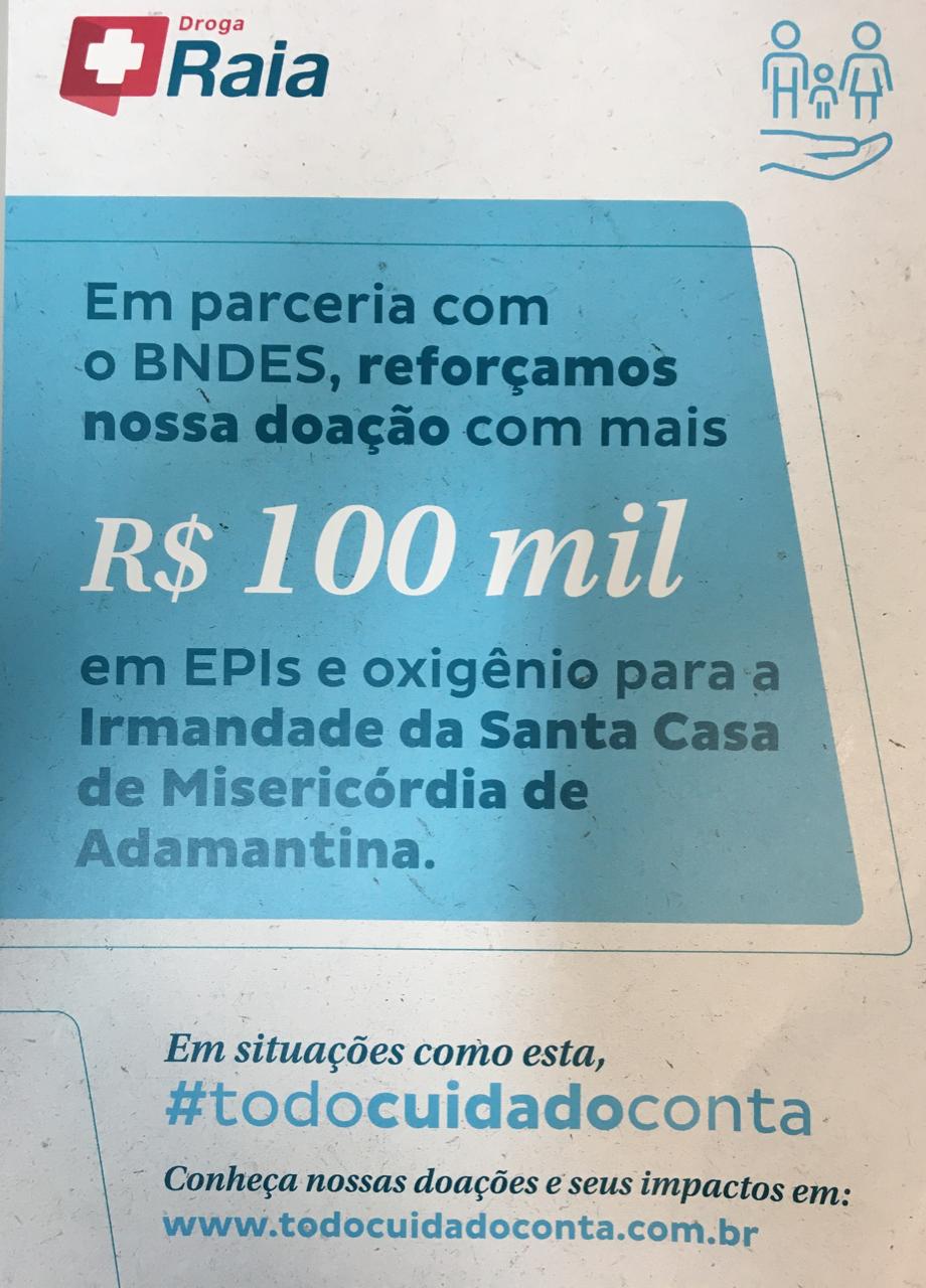 A Rede RD (empresa que administra as farmácias Droga Raia e Drogasil), por meio da campanha #TodoCuidadoConta, vai doar R$ 100 mil para a Santa Casa de Adamantina, para ajudar o hospital no enfrentamento à Covid-19. A confirmação foi dada ao SIGA MAIS nesta sexta-feira (30) pela gerente farmacêutica da Droga Raia de Adamantina, Maria Luiza Essi.