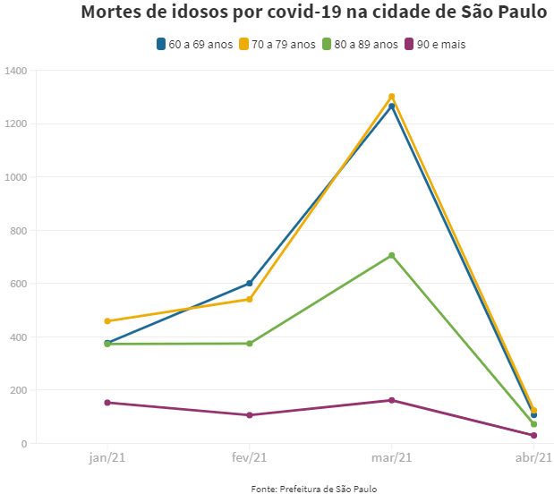De acordo com o UOL, em todas as faixas etárias, no mês de abril, houve uma queda brusca no número de mortes. Ao todo, em março, 3.437 mortes de idosos por covid-19 foram registradas na cidade. No mês seguinte, o número caiu para 333, uma diminuição de 90%.